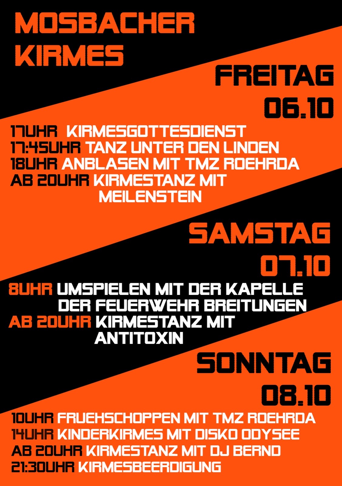 Am Samstag, den 07. Oktober 2023, beginnen die Kirmesburschen gemeinsam mit der Kapelle der Feuerwehr Breitungen ihr Umspiel durch das Dorf. Die ersten Mosbacher dürfen sich bereits ab 8 Uhr auf ein eigenes Ständchen freuen. Ab 20 Uhr lädt der Kirmesverein zum Tanz in die Triftberghalle mit Antitoxin ein.