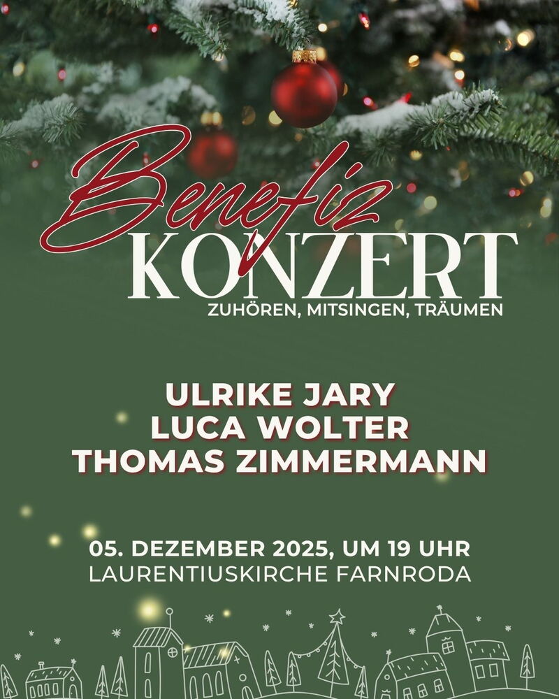 Freitag05. Dezember 2025 19:00 Laurentiuskirche Farnroda, 99848 Wutha-Farnroda Benefizkonzert Benefizkonzert - zuhören, Mitsingen, Träumen Ulrike Jary, Luca Wolter, Thomas Zimmermann Zurück Veranstaltungen und Termine Dezember 2025 Montag Dienstag Mittwoch Donnerstag Freitag Samstag Sonntag 1 2 3 4 5 6 7 8 9 10 11 12 13 14 15 16 17 18 19 20 21 22 23 24 25 26 27 28 29 30 31 Di 02 Dez ev. Kirche Eltern-Kind-Kreis Gemeindehaus Mi 03 Dez Weihnachtsmarkt bei den Hörseltalzwergen Kindergarten Hörseltalzwerge Do 04 Dez Senior*innenweihnachtsfeier Hörselberghalle Alle Veranstaltungen Veranstaltungen Druckansicht Neueste Nachrichten 26. November 2025 Gemeinde Neuer Jahreskalender der Gemeinde 24. November 2025 Gemeinde Die Telekom informiert 20. November 2025 Gemeinde Straßensperrung Am Rotberg/Ringstraße Aktuelle Informationen zu Einschränkungen im Straßenverkehr 18. November 2025 Gemeinde Das Forstamt Marksuhl informiert Wildverkauf am Waldbad Mosbach 12. November 2025 Gemeinde Das Landratsamt Wartburgkreis informiert Wartburgkreis erlässt Katzenschutzverordnung 12. November 2025 Gemeinde Das Landratsamt Wartburgkreis informiert Wartburgkreis erlässt Allgemeinverfügung zum Schutz vor Geflügelpest