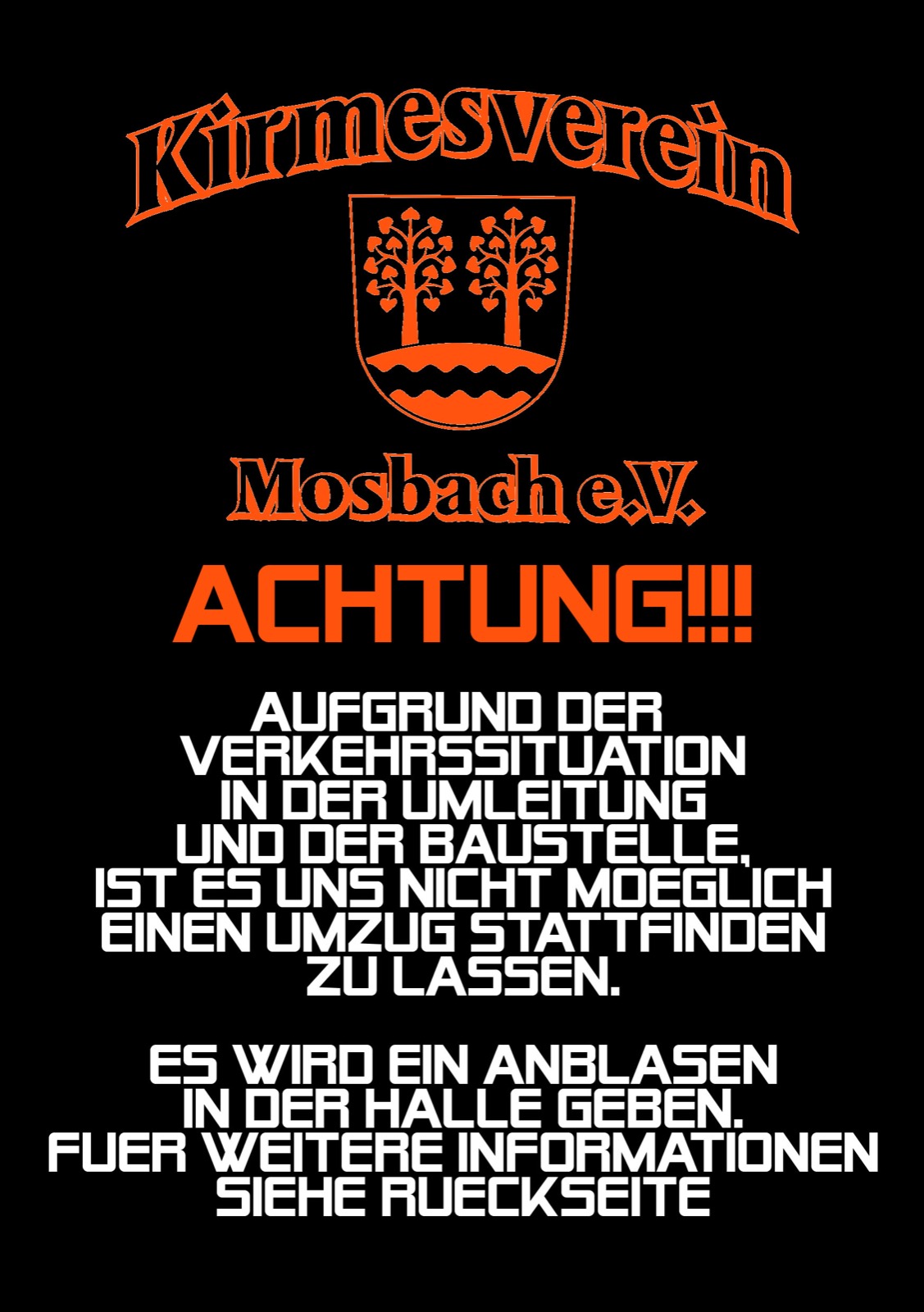 Auch in diesem Jahr wird in Mosbach Anfang Oktober Kirmes gehalten. Allerdings kann leider nicht am bekannten Ablauf festgehalten werden: So ist es aufgrund der Baustelle in der Theo-Neubauer-Straße nicht möglich mit dem traditionellen Umzug in das Kirmeswochenende zu starten. Ein Umzug durch das halbe Dorf stand für die Kirmesgesellschaft, die Organisatoren und alle weiteren Mitwirkenden nicht zur Debatte. Daher wird bereits am Freitag, den 06. Oktober 2023, zum Kirmesgottesdienst um 17 Uhr in die Kirche zu Mosbach geladen. Daran angeschlossen findet circa 17:45 Uhr der alljährliche Tanz unter den Linden statt und es wird bereits ab 18 Uhr ein Anblasen in der Triftberghalle geben. Begleitet wird dies von der Blaskapelle TMZ Röhrda, welche die Verantwortung für musikalische Untermalung des Abendprogrammes an die Band Meilenstein übergibt.