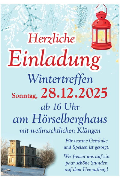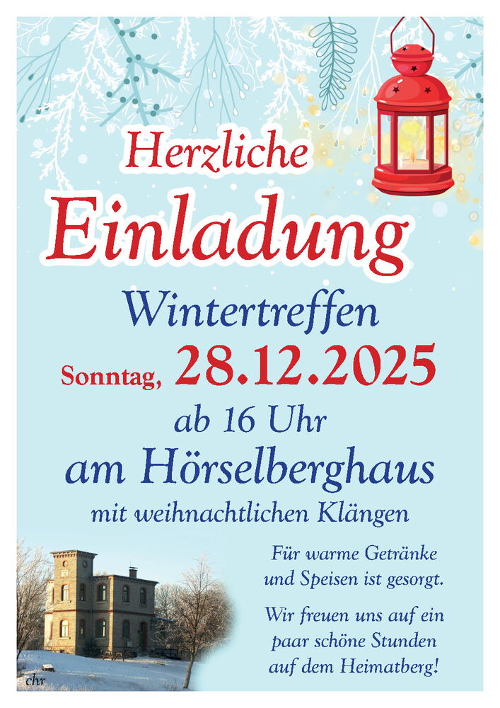 Sonntag28. Dezember 2025 16:00 Großer Hörselberg Wintertreffen auf dem Großen Hörselberg WintertreffenSonntag, 28.12.2025ab 16 Uhram Hörselberghaus mit weihnachtlichen KlängenFür warme Getränke und Speisen ist gesorgt.Wir freuen uns auf ein paar schöne Stunden auf dem Heimatberg. Zurück Veranstaltungen und Termine Dezember 2025 Montag Dienstag Mittwoch Donnerstag Freitag Samstag Sonntag 1 2 3 4 5 6 7 8 9 10 11 12 13 14 15 16 17 18 19 20 21 22 23 24 25 26 27 28 29 30 31 Di 16 Dez ev. Kirche Eltern-Kind-Kreis Gemeindehaus So 21 Dez Hörselberg-Weihnachten Berggasthaus Kleiner Hörselberg Alle Veranstaltungen Veranstaltungen Druckansicht Neueste Nachrichten 08. Dezember 2025 Gemeinde Aktuelle Informationen zu Einschränkungen im Straßenverkehr 03. Dezember 2025 Gemeinde Bibliothek geschlossen 26. November 2025 Gemeinde Neuer Jahreskalender der Gemeinde 24. November 2025 Gemeinde Die Telekom informiert 20. November 2025 Gemeinde Straßensperrung Am Rotberg/Ringstraße Aktuelle Informationen zu Einschränkungen im Straßenverkehr 18. November 2025 Gemeinde Das Forstamt Marksuhl informiert Wildverkauf am Waldbad Mosbach